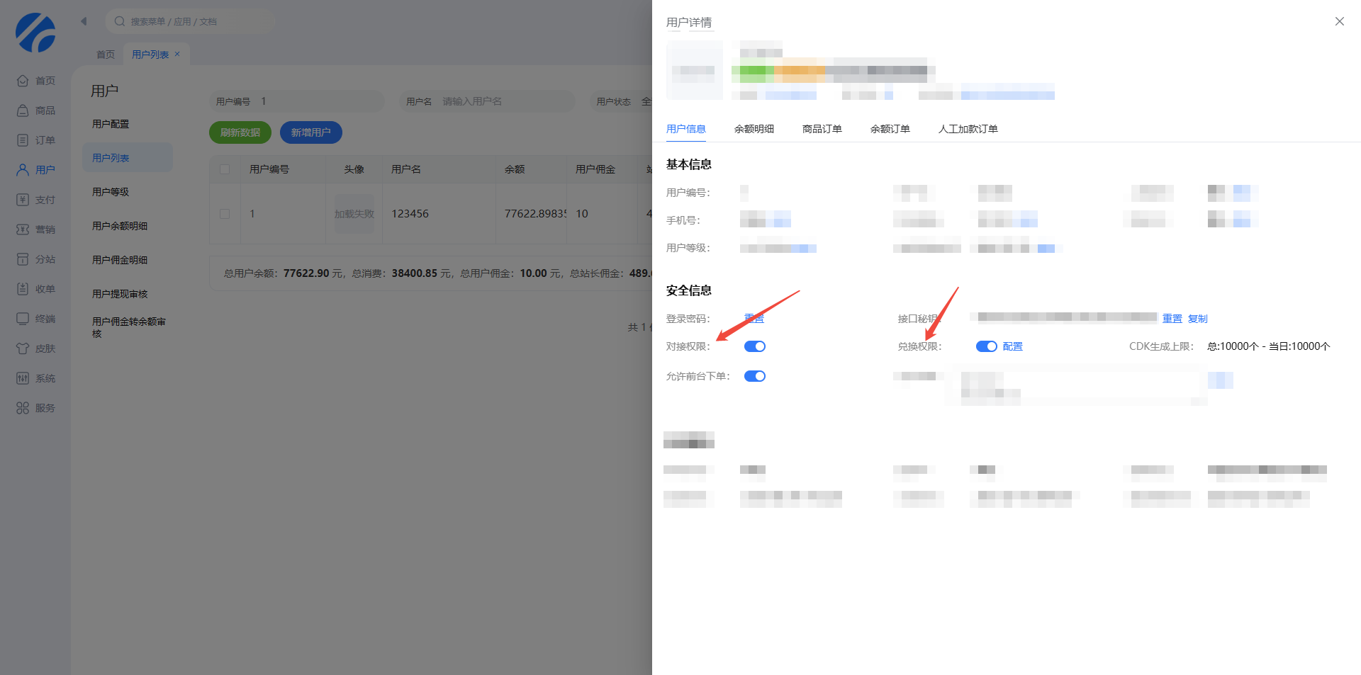 - 注意,保存完配置后需在后台打开对接权限,且保证账号余额足够