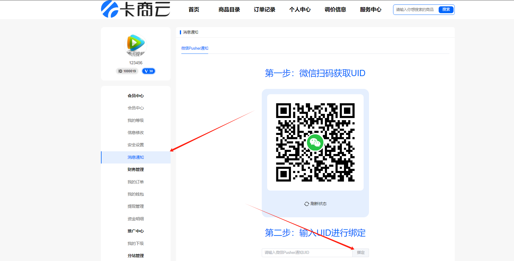 那么用户如何接收到下单通知呢,用户需要在前台绑定他自己的uid